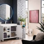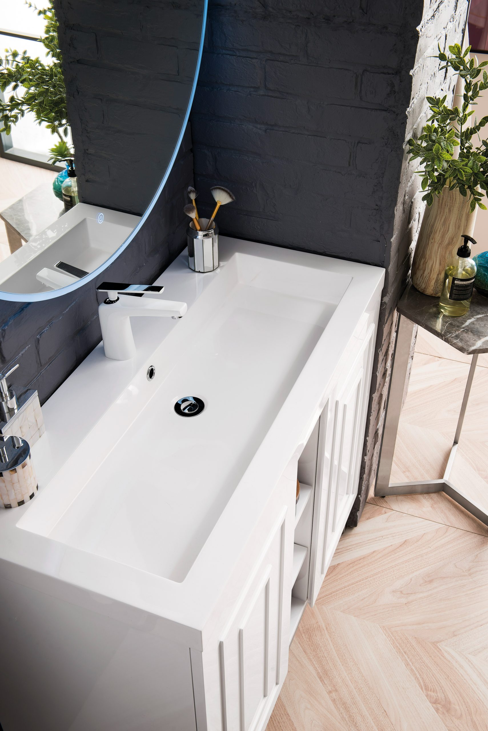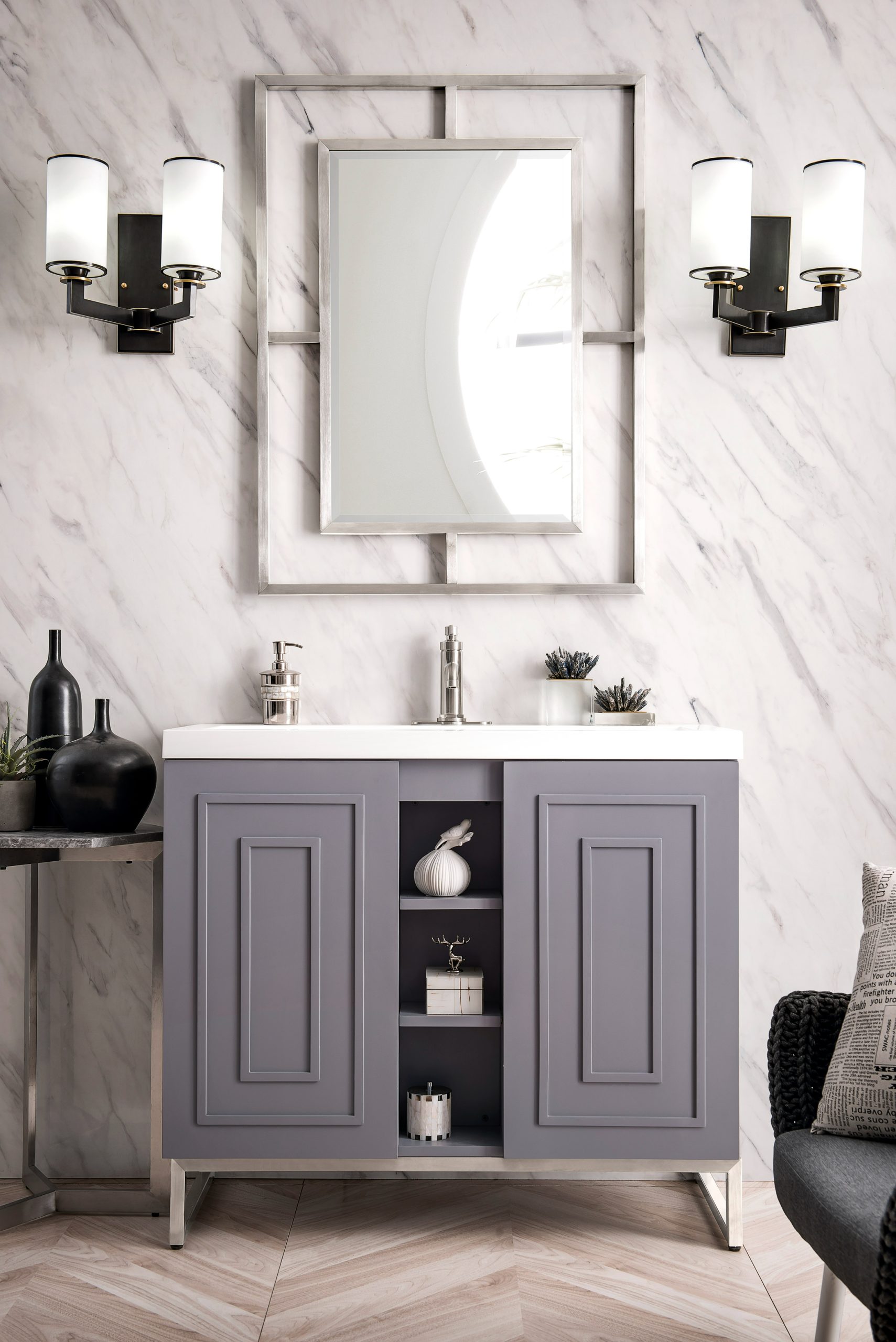 The Alicante 39.5″ Stainless Steel Vanity by James Martin Vanities is the perfect choice for any bathroom upgrade. Its sleek vanity is constructed of durable wood and is available in three different finishes grey smoke, glossy white, or mid-century acacia. Fine detailing on the frame accents its streamlined appearance, while its meta base gives it an updated modern appeal. Each door front has framed detailing, adding depth and visual interest to the piece. Keep all your toiletries, makeup and more in this elegant vanity. This vanity sits on three sturdy tapered legs and can be purchased without a top or with a top that includes a porcelain sink and predrilled holes for your favorite faucet.
