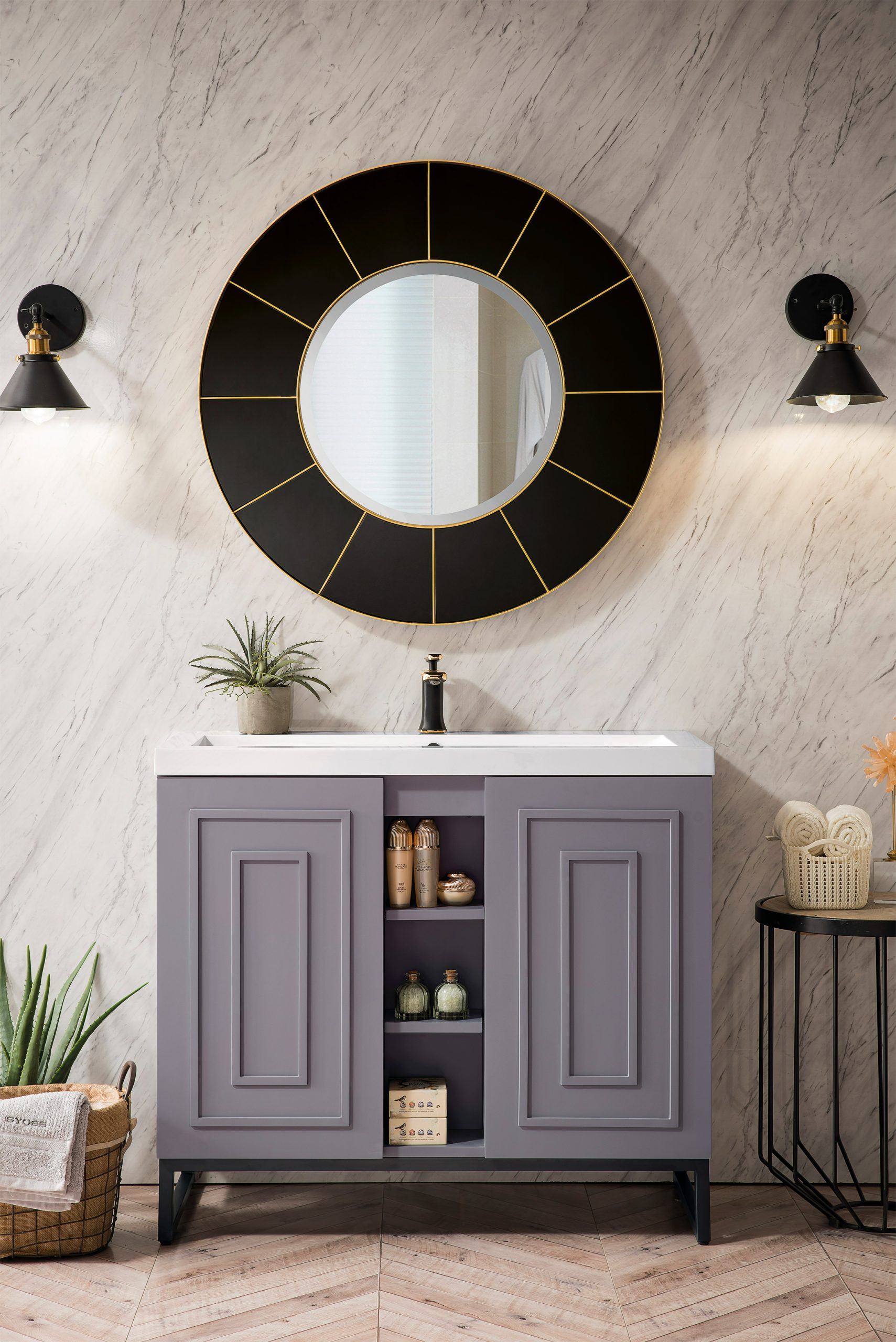The Alicante 39.5? Stainless Steel Vanity by James Martin Vanities is the perfect choice for any bathroom upgrade. Its sleek vanity is constructed of durable wood and is available in three different finishes grey smoke, glossy white, or mid-century acacia. Fine detailing on the frame accents its streamlined appearance, while its meta base gives it an updated modern appeal. Each door front has framed detailing, adding depth and visual interest to the piece. Keep all your toiletries, makeup and more in this elegant vanity. This vanity sits on three sturdy tapered legs and can be purchased without a top or with a top that includes a porcelain sink and predrilled holes for your favorite faucet.?