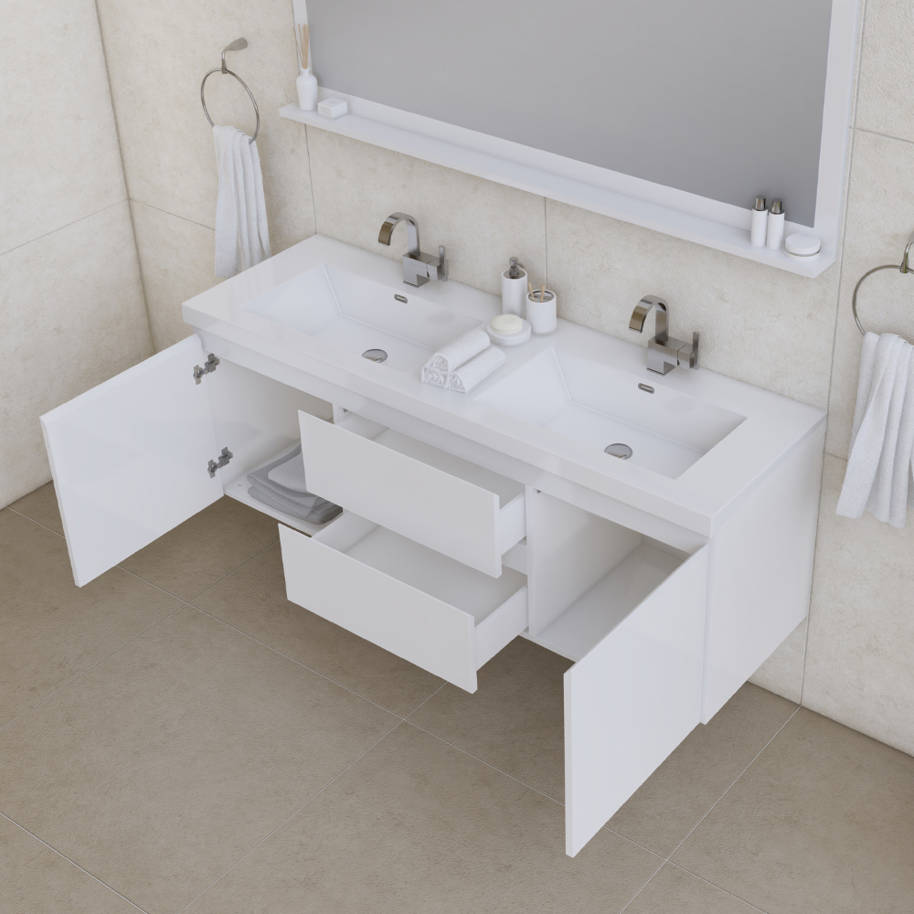 Elevate your bathroom with the Paterno 60 Inch Double Wall Mount Bathroom Vanity in Glossy White – a perfect fusion of modern aesthetics and everyday functionality. This sleek floating vanity enhances space while providing ample storage for a clutter-free, contemporary look.