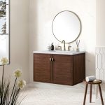 The 36″ Amberly bathroom vanity celebrates Mid-Century simplistic forms and finish details combined with practical function. The beauty of the natural grains in the walnut veneer steals the show, while the decorative, oval knobs in Champagne Brass provide the perfect accent. This two-door cabinet opens to a spacious interior with a single shelf and a convenient USB/Electric power outlet. The elegant wood base elevates the vanity cabinet in a true console style, though you may choose the more modern, space-saving wall-mount option. The 3 cm, eased-edge Eternal Serena Silestone quartz top completes the look.