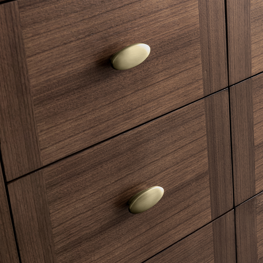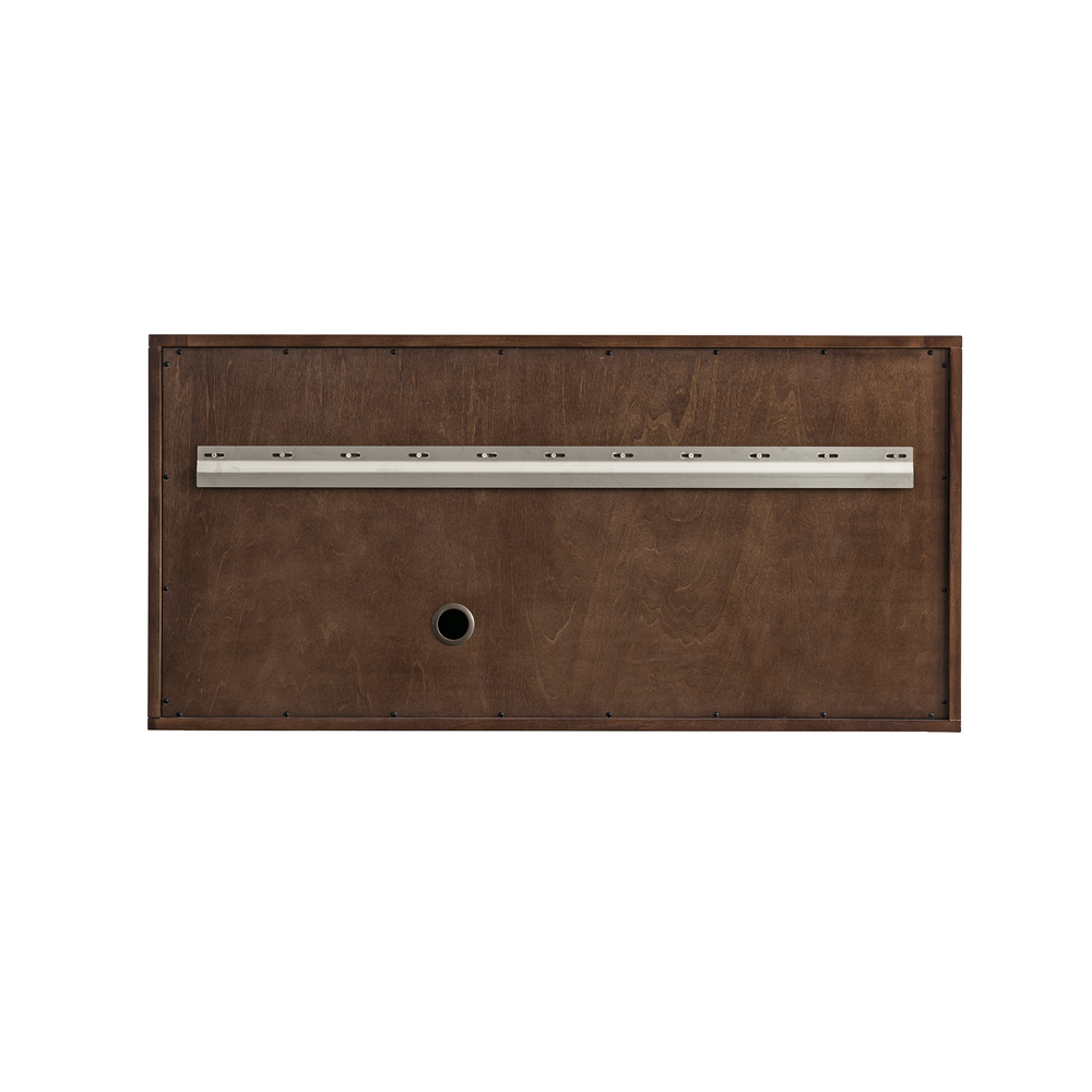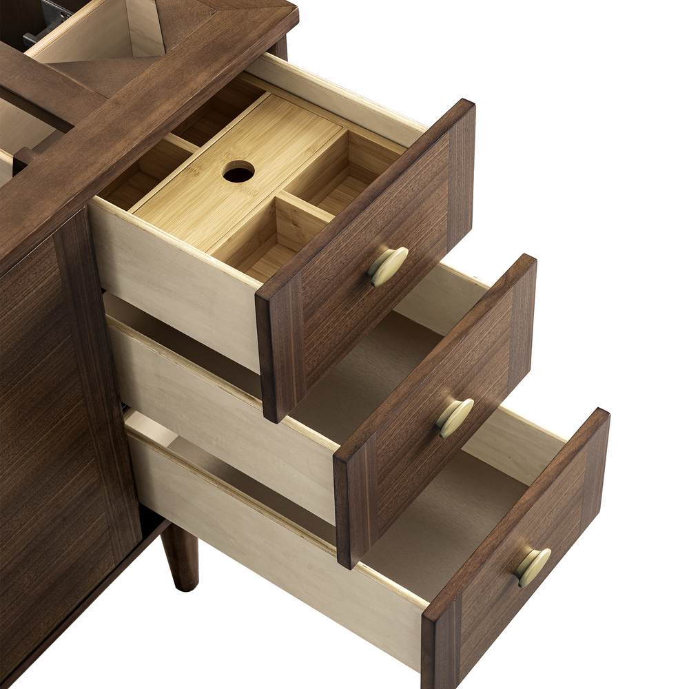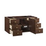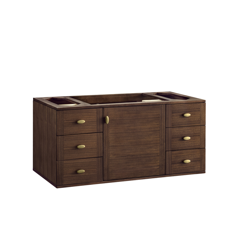 The 48″ Amberly single vanity celebrates Mid-Century simplistic forms and finish details combined with practical function. The beauty of the natural grains in the walnut veneer steals the show, while the decorative, oval knobs in Champagne Brass provide the perfect accent. This single-door cabinet opens to a spacious interior with a single shelf and a convenient USB/Electric power outlet. Six drawers provide ample storage and include one removable bamboo organizer. The elegant wood base elevates the vanity cabinet in a true console style, though you may choose the more modern, space-saving wall-mount option.