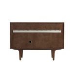 The Mid-Century Modern inspired Amberly bathroom vanity collection showcases a rich walnut wood cabinet, set elegantly atop subtly curved legs, and accented with oval Champagne Brass pulls.