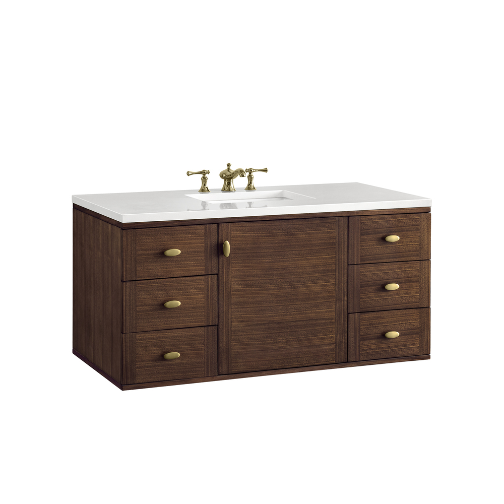 The 48″ Amberly single vanity celebrates Mid-Century simplistic forms and finish details combined with practical function. The beauty of the natural grains in the walnut veneer steals the show, while the decorative, oval knobs in Champagne Brass provide the perfect accent. This single-door cabinet opens to a spacious interior with a single shelf and a convenient USB/Electric power outlet. Six drawers provide ample storage and include one removable bamboo organizer. The elegant wood base elevates the vanity cabinet in a true console style, though you may choose the more modern, space-saving wall-mount option.