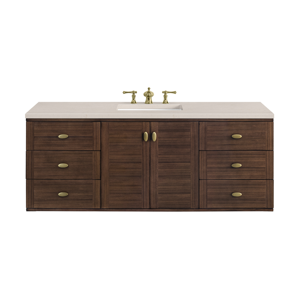 The 60″ Amberly single vanity celebrates Mid-Century simplistic forms and finish details combined with practical function. The beauty of the natural grains in the walnut veneer steals the show, while the decorative, oval knobs in Champagne Brass provide the perfect accent. This two-door cabinet opens to spacious interior storage with adjustable shelves and a convenient USB/Electric power outlet. Six drawers provide ample storage and include one removable bamboo organizer. The top row drawers are tip-out style. The elegant wood base elevates the vanity cabinet in a true console style, though you may choose the more modern, space-saving wall-mount option.