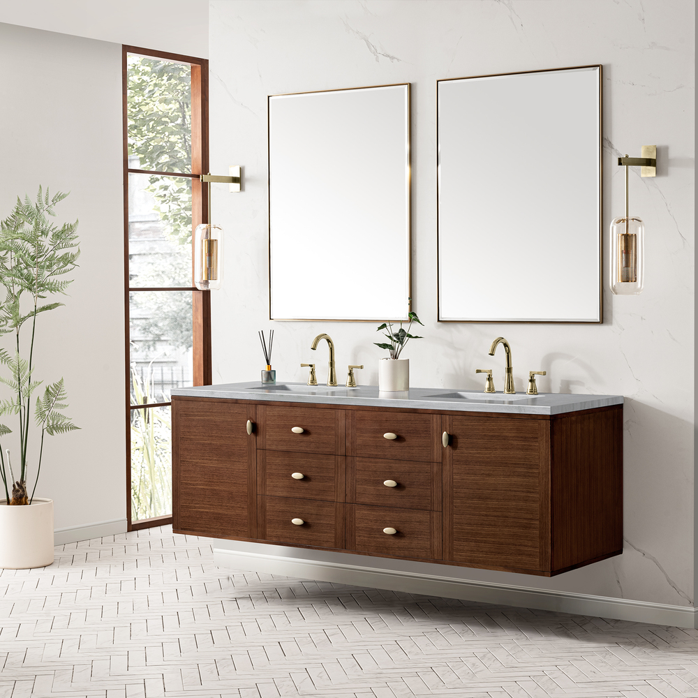 The 72″ Amberly double vanity celebrates Mid-Century simplistic forms and finish details combined with practical function. The beauty of the natural grains in the walnut veneer steals the show, while the decorative, oval knobs in Champagne Brass provide the perfect accent. This two-door cabinet opens to spacious interior storage with adjustable shelves and a convenient USB/Electric power outlet. Six drawers provide ample storage and include one removable bamboo organizer. The top row drawers are tip-out style. The elegant wood base elevates the vanity cabinet in a true console style, though you may choose the more modern, space-saving wall-mount option.