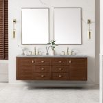 The 72″ Amberly double vanity celebrates Mid-Century simplistic forms and finish details combined with practical function. The beauty of the natural grains in the walnut veneer steals the show, while the decorative, oval knobs in Champagne Brass provide the perfect accent. This two-door cabinet opens to spacious interior storage with adjustable shelves and a convenient USB/Electric power outlet. Six drawers provide ample storage and include one removable bamboo organizer. The top row drawers are tip-out style. The elegant wood base elevates the vanity cabinet in a true console style, though you may choose the more modern, space-saving wall-mount option.