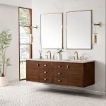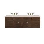 The 72″ Amberly double vanity celebrates Mid-Century simplistic forms and finish details combined with practical function. The beauty of the natural grains in the walnut veneer steals the show, while the decorative, oval knobs in Champagne Brass provide the perfect accent. This two-door cabinet opens to spacious interior storage with adjustable shelves and a convenient USB/Electric power outlet. Six drawers provide ample storage and include one removable bamboo organizer. The top row drawers are tip-out style. The elegant wood base elevates the vanity cabinet in a true console style, though you may choose the more modern, space-saving wall-mount option.