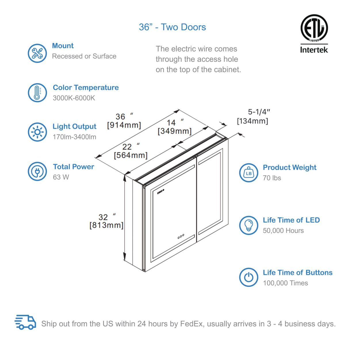 The Asta 36 inch LED lighted Medicine Cabinet seamlessly complements modern or contemporary style decor for any space. Along with energy saving LED lights, this mirror features three level dimmers, color temperature adjustment, one touch defogger, and auto memory.