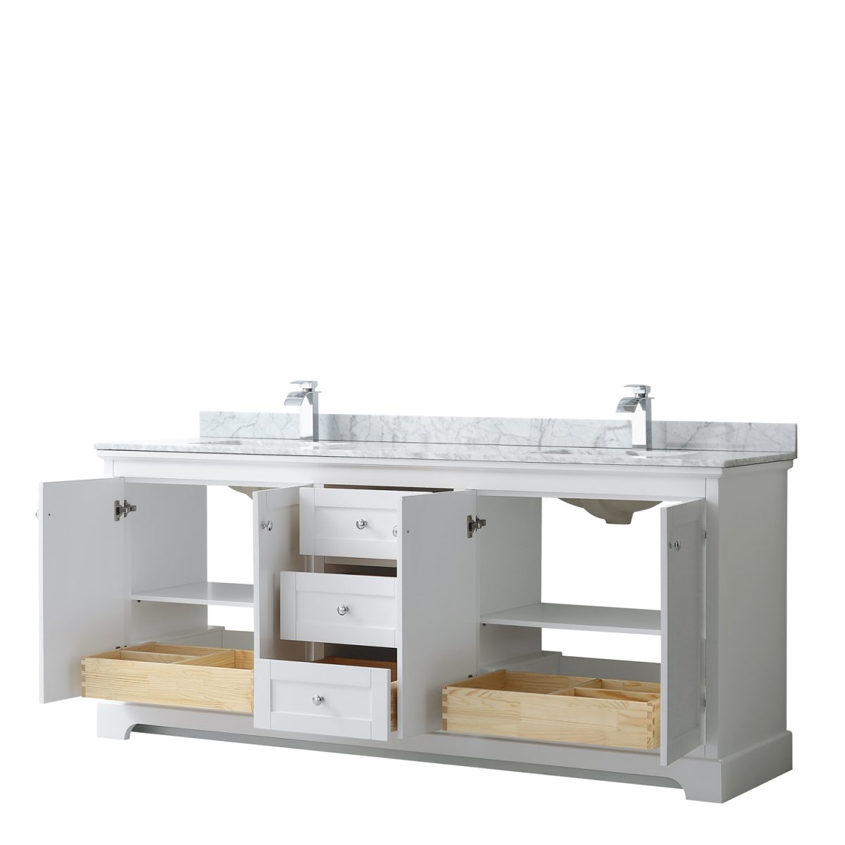 Avery 80 inch transitional style double bathroom vanity With White Carrara Marble Top bridges the gap between contemporary and classic design that will add that touch of perfection to any bathroom remodel.