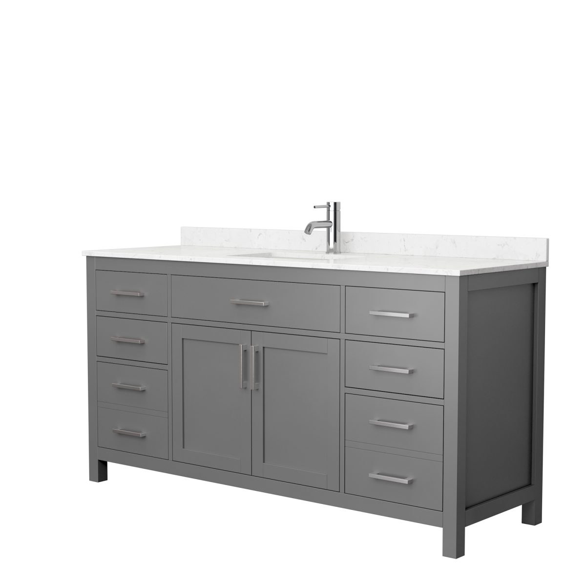 Beckett 66 inch single bathroom vanity in Dark Gray With Carrara Cultured Marble Top has it all, with quality touches like brushed nickel accents, dovetailed drawers, and soft-close doors and drawers.
