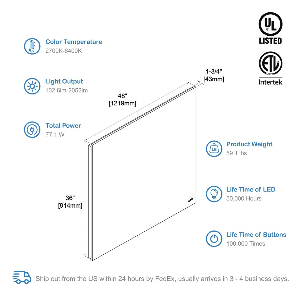 Beta 48 inch x 36 inch LED Lighted Bathroom Mirror with frosted sides seamlessly complements modern or contemporary style decor for any space. Along with energy saving LED lights, this mirror features three level dimmers, color temperature adjustment, one touch defogger, and auto memory.