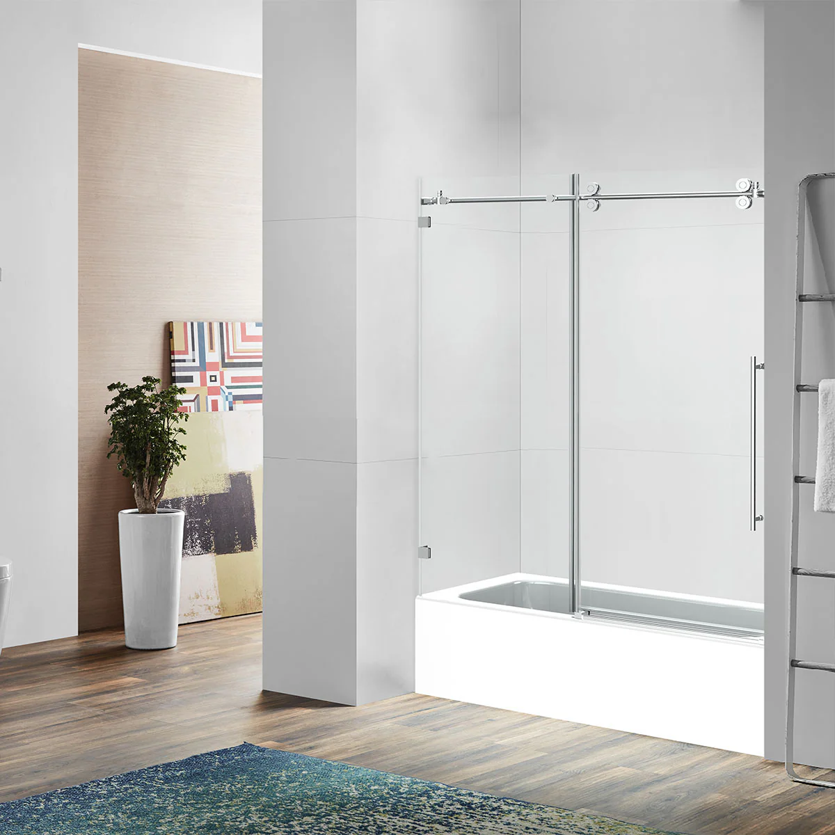 Bhavana 60″ Frameless Sliding Tub Door, where elegance meets functionality. Designed to transform your bathroom into a serene retreat, Bhavana Shower Doors combine sleek craftsmanship with premium materials, offering timeless style and lasting durability.