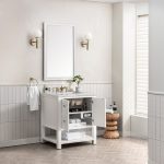 The beautiful Breckenridge 30″ Vanity in Bright White features round Champagne Brass knobs that perfectly complement the clean look of this cabinet. The faux-drawer style doors open to an interior shelf with convenient built-in USB/electric outlets. The lower shelf with extra storage for towels and decor completes the cabinet.