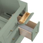 The Breckenridge 36″ vanity cabinet in Smokey Celadon brings a fresh new style with classic features to your bathroom. Make a statement with this muted, yet moody, neutral shade of green. The clean, symmetrical fa?ade features a single door which opens to an interior shelf, with convenient access to built-in USB/electric outlets. Two traditional and two tip-out style top-row drawers add suitable organization. The lower, integrated shelf provides extra storage for towels and decor.