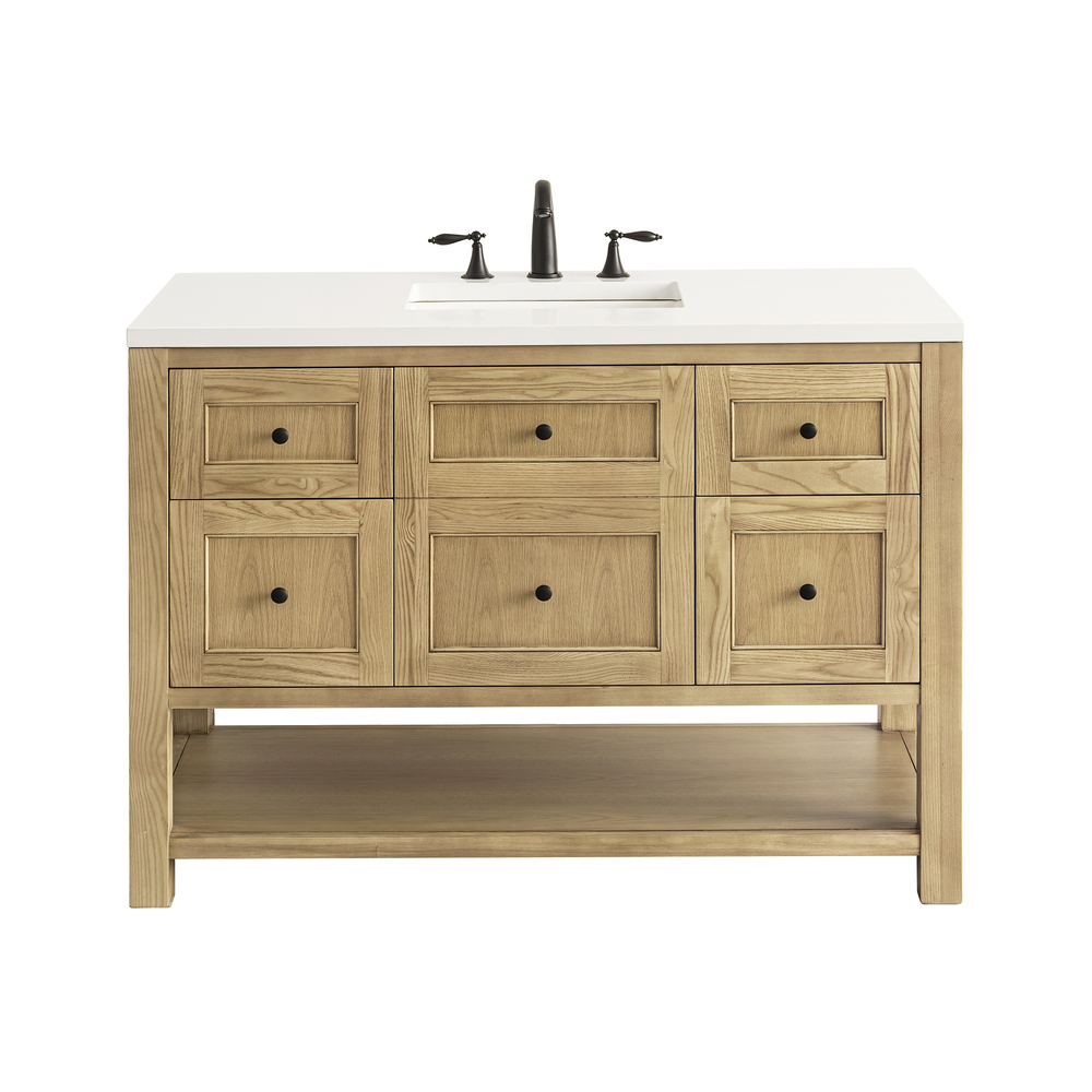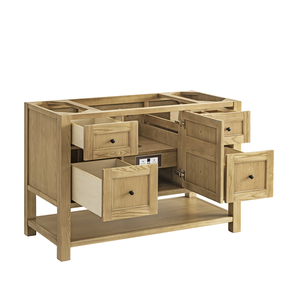 The Breckenridge 48″ vanity cabinet in Light Natural Oak with Matte Black mushroom-style knobs is Modern Farmhouse at its best.. This vanity’s clean, symmetrical fa?ade features a center door that opens to a convenient dual-power USB outlet. Four drawers and a removable Bamboo drawer organizer tray provide additional organization. The lower, integrated shelf offers extra storage for towels and decor.