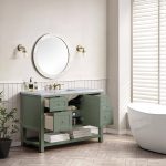 The beautiful Breckenridge 48″ Vanity in Smokey Celadon features round Champagne Brass knobs that perfectly complement the clean look of this cabinet. The faux-drawer style doors open to an interior shelf with convenient built-in USB/electric outlets. The lower shelf with extra storage for towels and decor completes the cabinet.