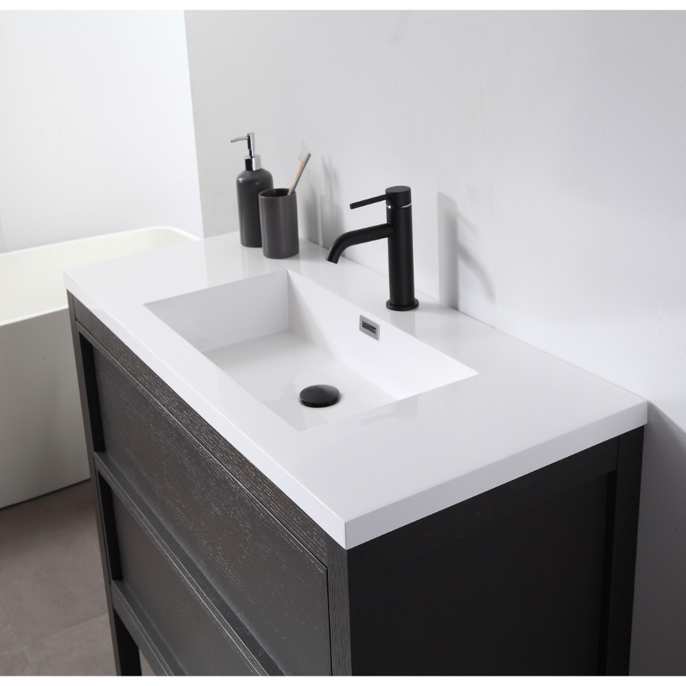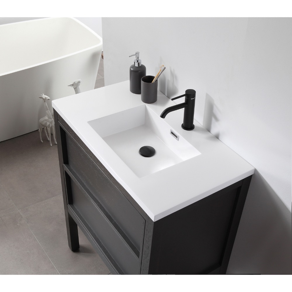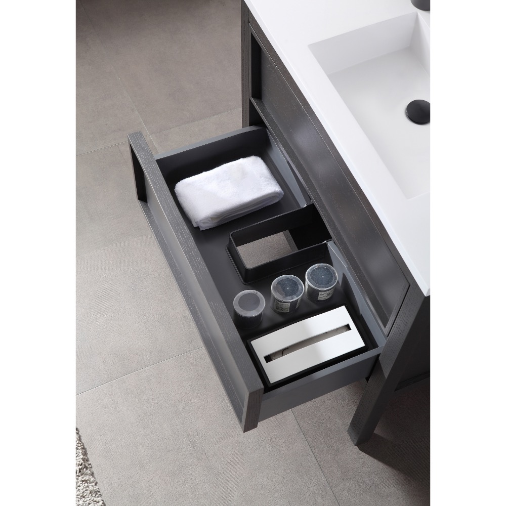 Annecy 24 inch Bathroom Vanity in Charcoal Oak with Top, brings the simplicity of design and freshness to the bathroom. This freestanding vanity includes a glossy pure white countertop and sink that gives equal line of peaceful relaxation to any bath design.