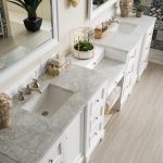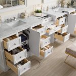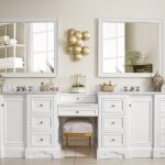 The De Soto 118″ Bright White double vanity, 2 cabinets connected by a matching make-up counter. Premium features include a plinth base, one electrical component with usb ports, and one faux shagreen drawer organizer. Ample interior drawer and shelf space along with an optional decorative wood backsplash, tops and sinks included.