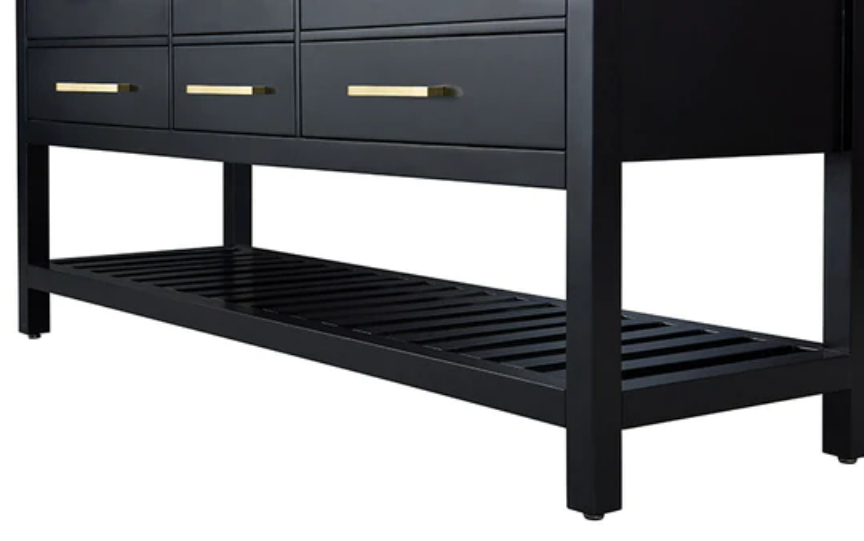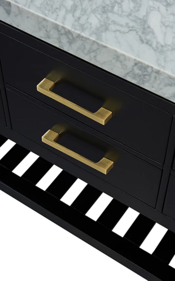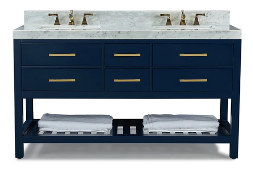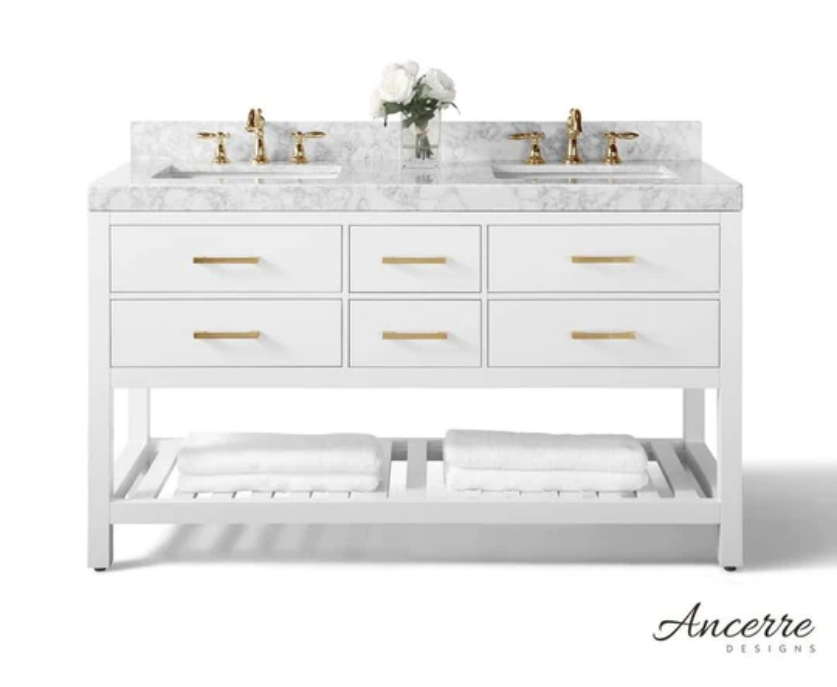 The Elizabeth Collection is a pure transitional design that brings balance & harmony to any space. From selecting quality wood to using the most durable soft-close hardware, no details were overlooked in crafting the Elizabeth 60 in. Vanity Set. The vanity set includes a furniture style cabinet, a thick imported Italian Carrara White marble top with a 4 in. backsplash, wide rectangular under mount basin, solid wood dovetailed drawer boxes, soft-close doors & drawers and gold finish hardware.