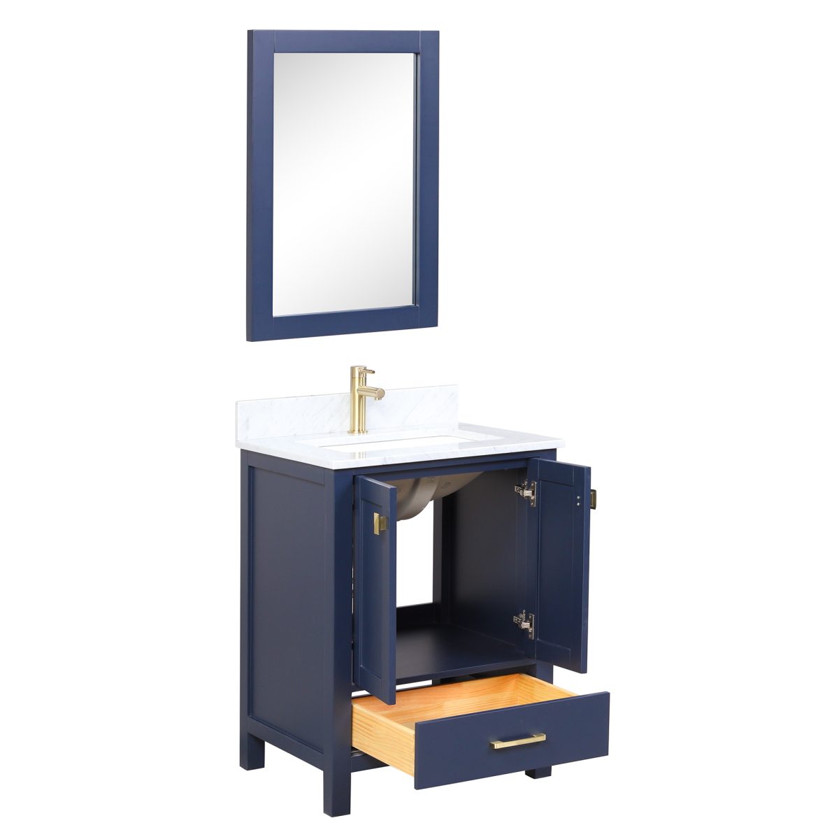 The Geneva 24″ Bathroom Vanity Navy Blue with Carrara Marble Countertop is crafted with solid wood construction. Each with a Carrara Marble Countertop, creates a beautiful and sleek bathroom vanity for your transitional space.