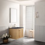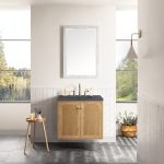 The 30″ Laurent bathroom vanity features picture frame detailing with unexpected soft curves. The Light Natural Oak finish over cathedral grain ash veneers creates modern rustic appeal. This vanity offers two door cabinet with one interior, adjustable height shelf and convenient dual power and USB outlet. Choose to install it as a free-standing vanity with the modern wood base, or choose to float it on your wall using our durable french cleat hardware. The beautiful natural wood texture, elegant detailing, and Champagne Brass knobs create a point of interest in any bathroom space.