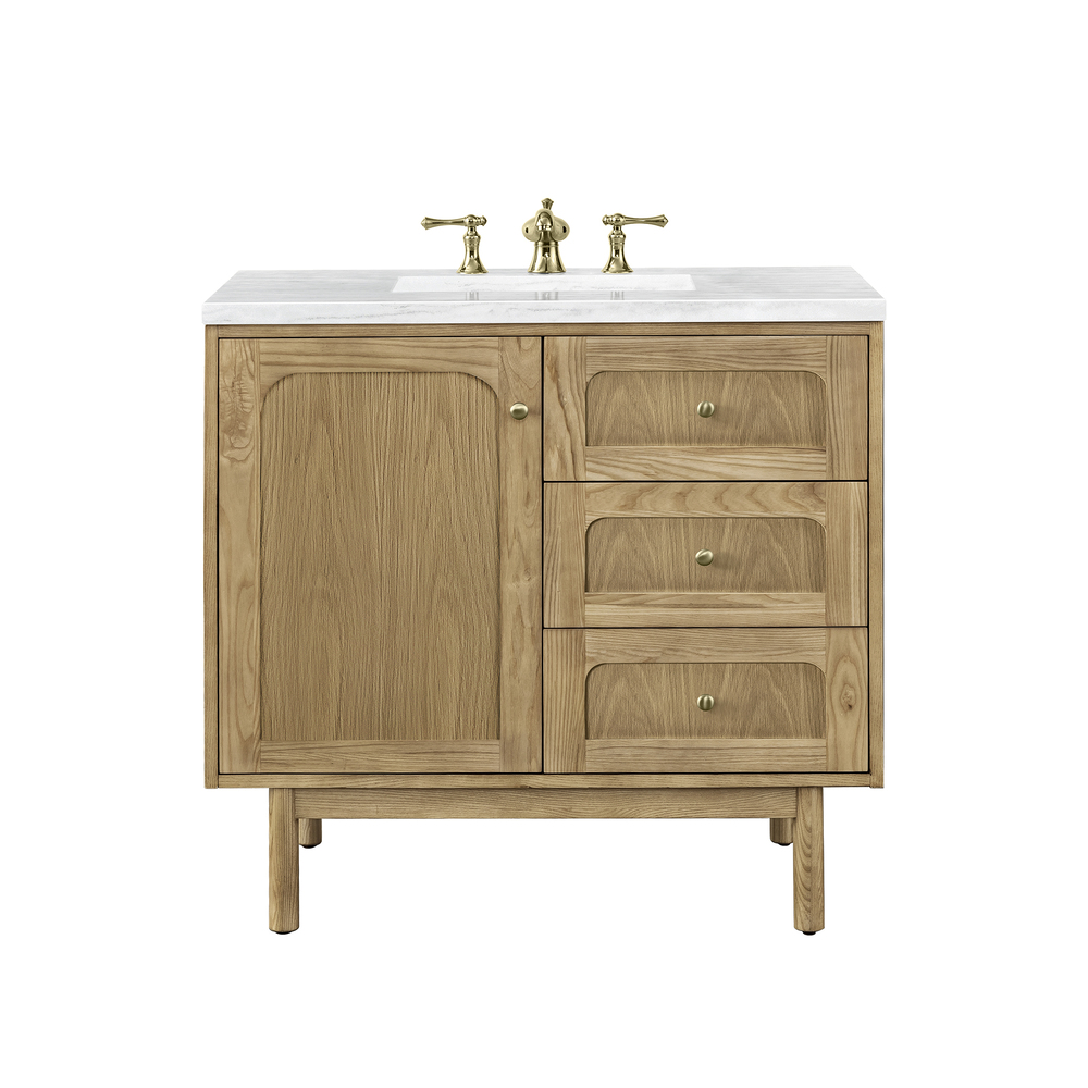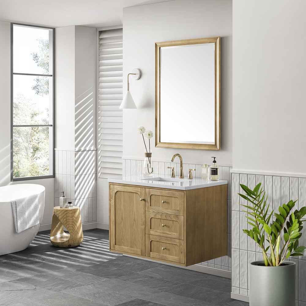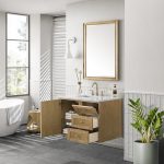 The 36″ Laurent bathroom vanity features picture frame detailing with unexpected soft curves. The Light Natural Oak finish over cathedral grain ash veneers creates modern rustic appeal. This vanity offers two doors that open to an adjustable shelf and convenient dual power and USB outlet. Choose to install it as a free-standing vanity with the modern wood base, or choose to float it on your wall using our durable french cleat hardware. The beautiful natural wood texture, elegant detailing, and Champagne Brass knobs create a point of interest in any bathroom space.