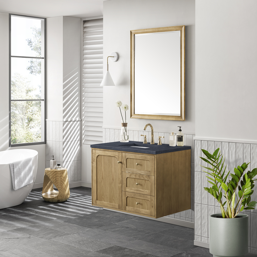 The 36″ Laurent bathroom vanity features picture frame detailing with unexpected soft curves. The Light Natural Oak finish over cathedral grain ash veneers creates modern rustic appeal. This vanity offers two doors that open to an adjustable shelf and convenient dual power and USB outlet. Choose to install it as a free-standing vanity with the modern wood base, or choose to float it on your wall using our durable french cleat hardware. The beautiful natural wood texture, elegant detailing, and Champagne Brass knobs create a point of interest in any bathroom space.