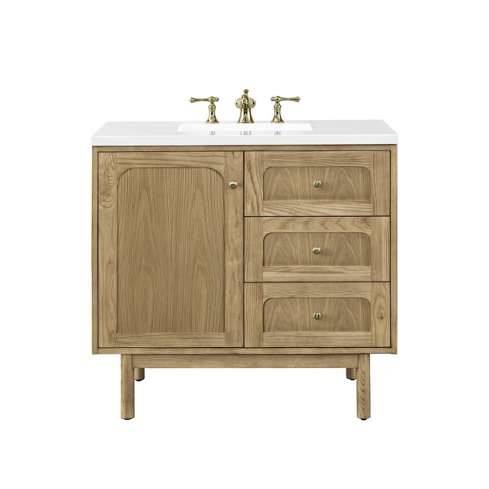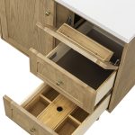 The 36″ Laurent bathroom vanity features picture frame detailing with unexpected soft curves. The Light Natural Oak finish over cathedral grain ash veneers creates modern rustic appeal. This vanity offers two doors that open to an adjustable shelf and convenient dual power and USB outlet. Choose to install it as a free-standing vanity with the modern wood base, or choose to float it on your wall using our durable french cleat hardware. The beautiful natural wood texture, elegant detailing, and Champagne Brass knobs create a point of interest in any bathroom space.