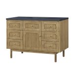 The 48″ Laurent bathroom vanity features picture frame detailing with unexpected soft curves. The Light Natural Oak finish over cathedral grain ash veneers creates modern rustic appeal. This vanity offers One door cabinet with one interior, adjustable height shelf and seven drawers, the middle-top row drawer is tip-out style and convenient dual power and USB outlet. Choose to install it as a free-standing vanity with the modern wood base, or choose to float it on your wall using our durable french cleat hardware. The beautiful natural wood texture, elegant detailing, and Champagne Brass knobs create a point of interest in any bathroom space.