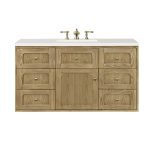 The 48″ Laurent bathroom vanity features picture frame detailing with unexpected soft curves. The Light Natural Oak finish over cathedral grain ash veneers creates modern rustic appeal. This vanity offers One door cabinet with one interior, adjustable height shelf and seven drawers, the middle-top row drawer is tip-out style and convenient dual power and USB outlet. Choose to install it as a free-standing vanity with the modern wood base, or choose to float it on your wall using our durable french cleat hardware. The beautiful natural wood texture, elegant detailing, and Champagne Brass knobs create a point of interest in any bathroom space.
