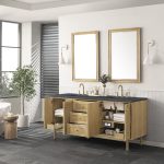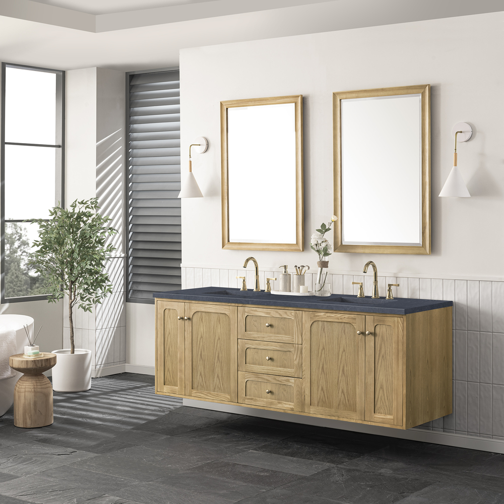 The 72″ Laurent double bathroom vanity features picture frame detailing with unexpected soft curves. The Light Natural Oak finish over cathedral grain ash veneers creates modern rustic appeal. This vanity offers four door cabinet with two interior, adjustable height shelves and five drawers, two are interior drawers the middle-top row drawer is tip-out style and convenient dual power and USB outlet. Choose to install it as a free-standing vanity with the modern wood base, or choose to float it on your wall using our durable french cleat hardware. The beautiful natural wood texture, elegant detailing, and Champagne Brass knobs create a point of interest in any bathroom space.