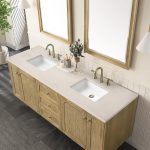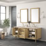 The 72″ Laurent double bathroom vanity features picture frame detailing with unexpected soft curves. The Light Natural Oak finish over cathedral grain ash veneers creates modern rustic appeal. This vanity offers four door cabinet with two interior, adjustable height shelves and five drawers, two are interior drawers the middle-top row drawer is tip-out style and convenient dual power and USB outlet. Choose to install it as a free-standing vanity with the modern wood base, or choose to float it on your wall using our durable french cleat hardware. The beautiful natural wood texture, elegant detailing, and Champagne Brass knobs create a point of interest in any bathroom space.