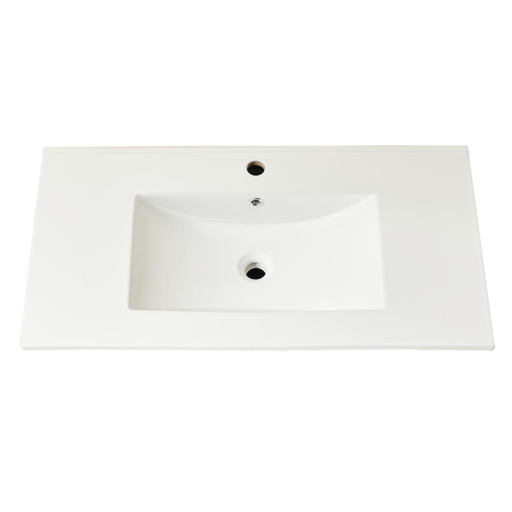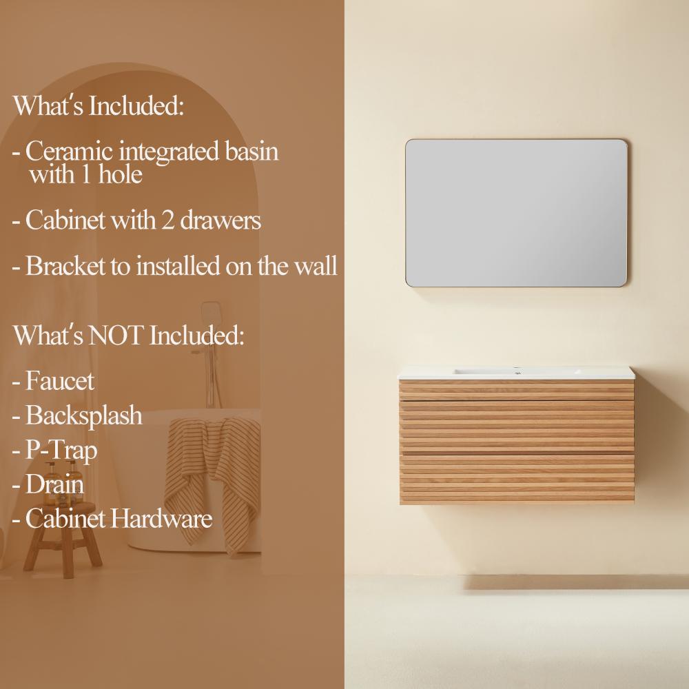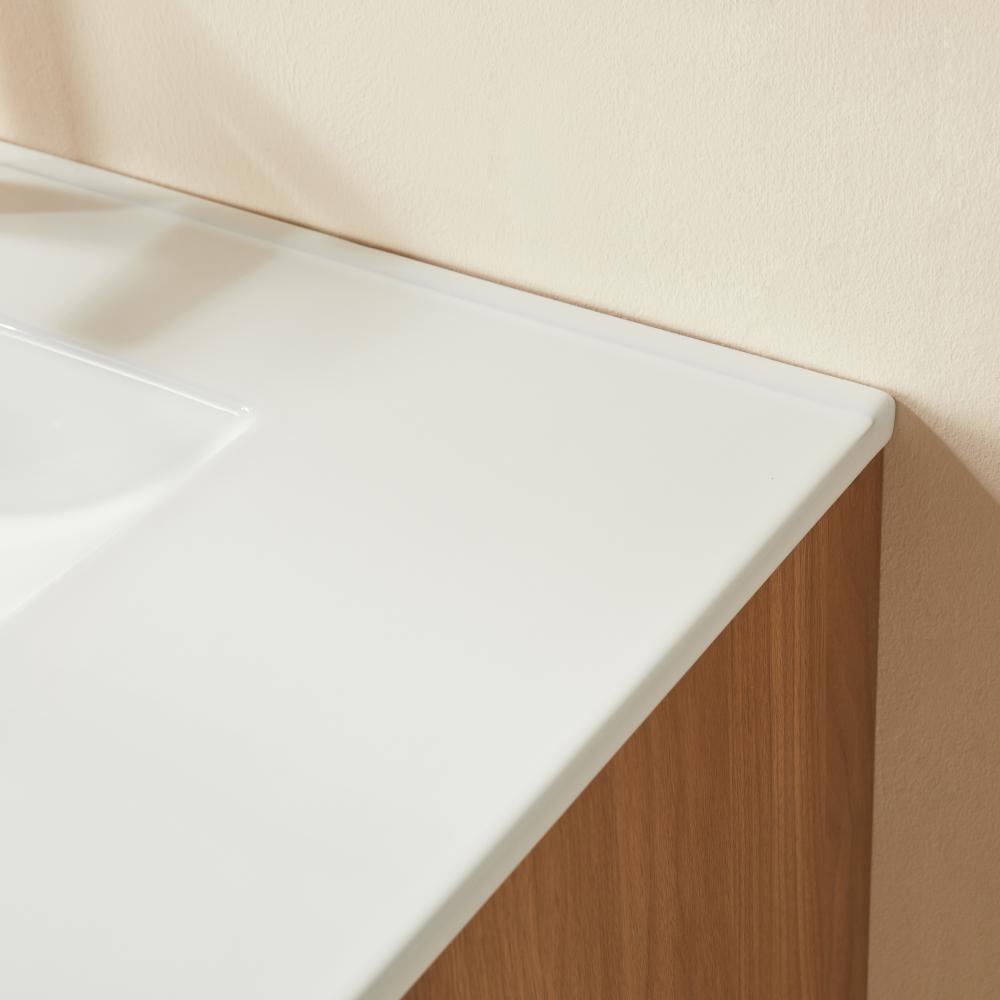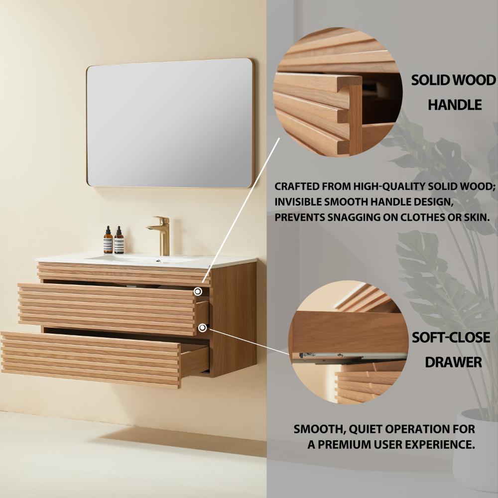 ts floating cabinet design features clean lines and a one-piece integrated ceramic sink with a single-hole faucet opening for a streamlined, functional look. Soft-close hardware on both doors and the center drawer ensures smooth, silent operation, while the U-shaped plumbing cutout in the drawer maximizes usability without sacrificing storage.