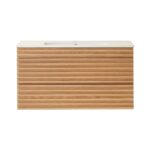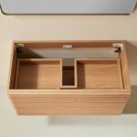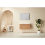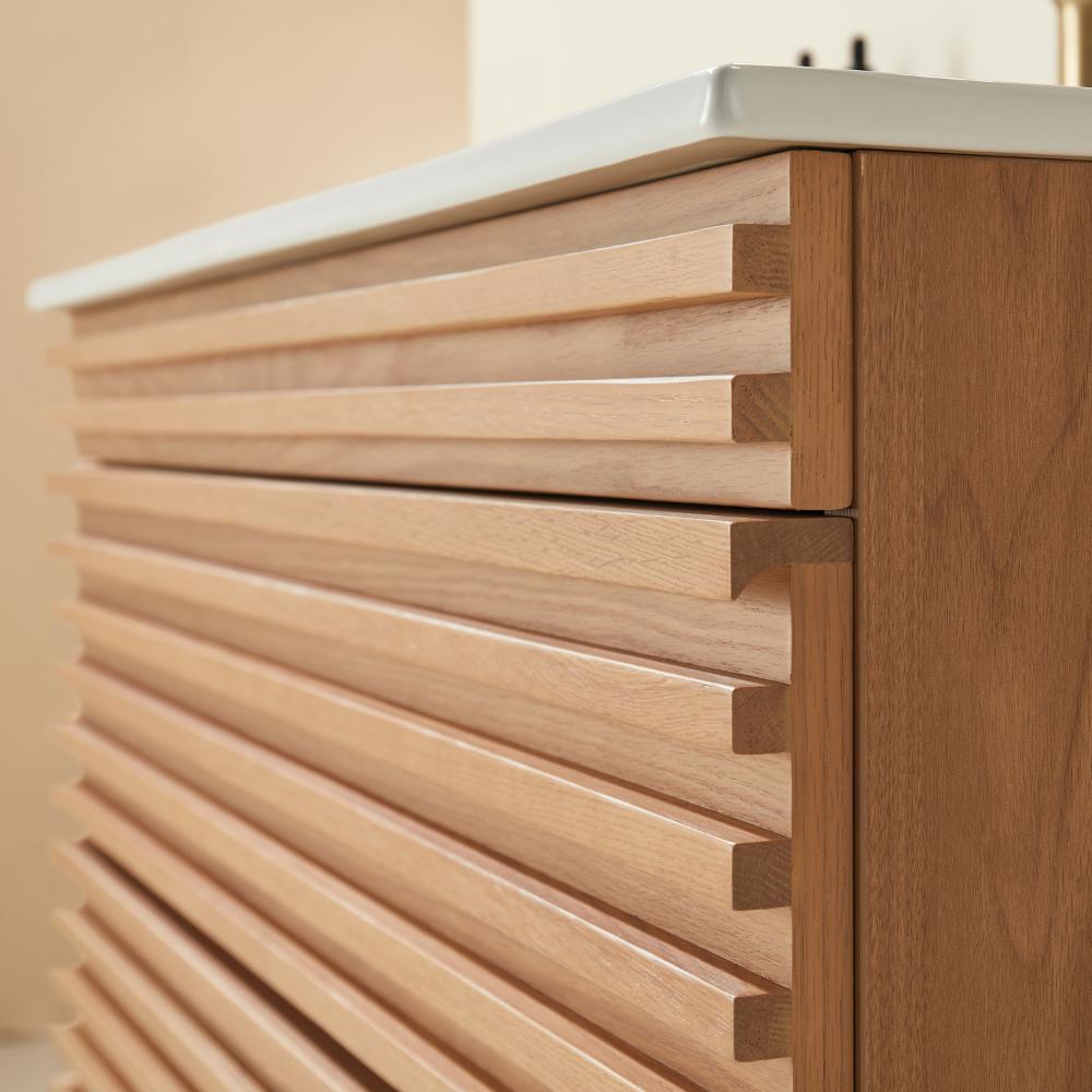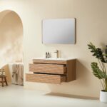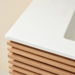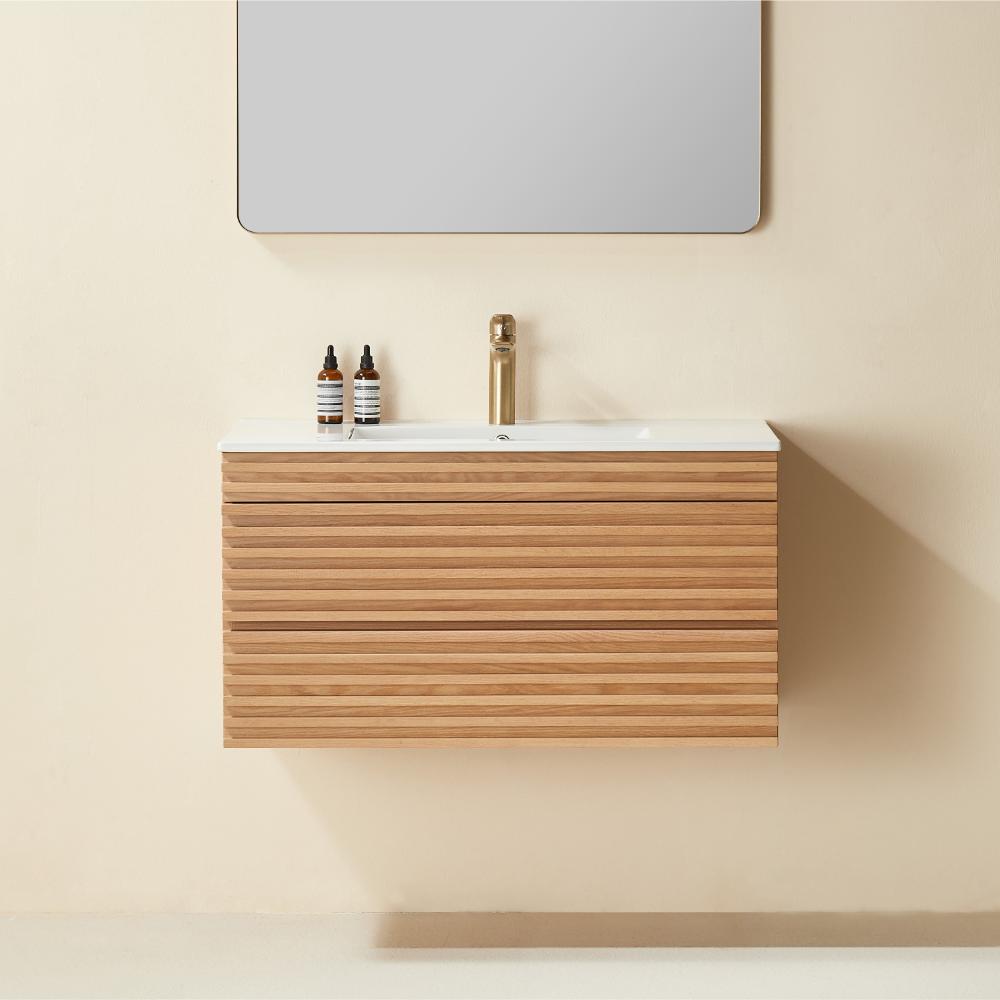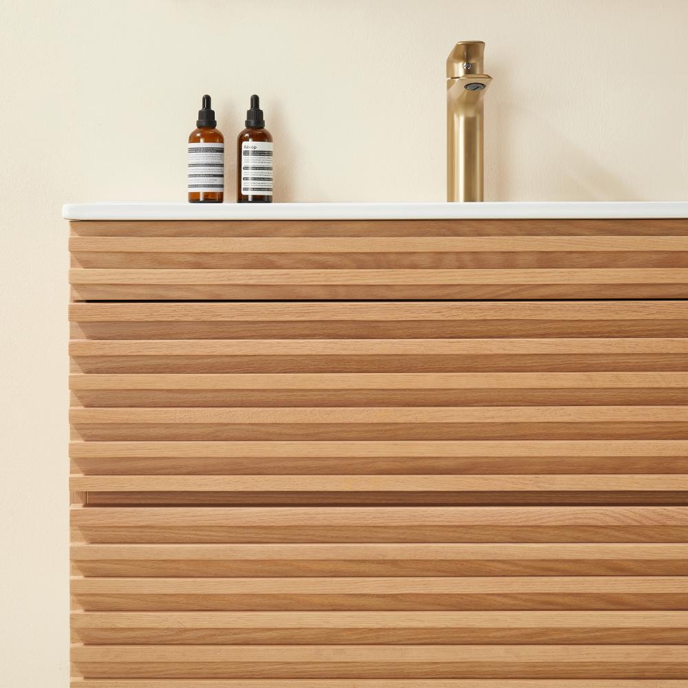 Linea 36 Inch Wall Mounted Vanity delivers sleek, modern elegance in a compact form. With its striped door design, light oak finish, and solid wood texture, it brings warmth and minimalist charm to smaller bathroom spaces.