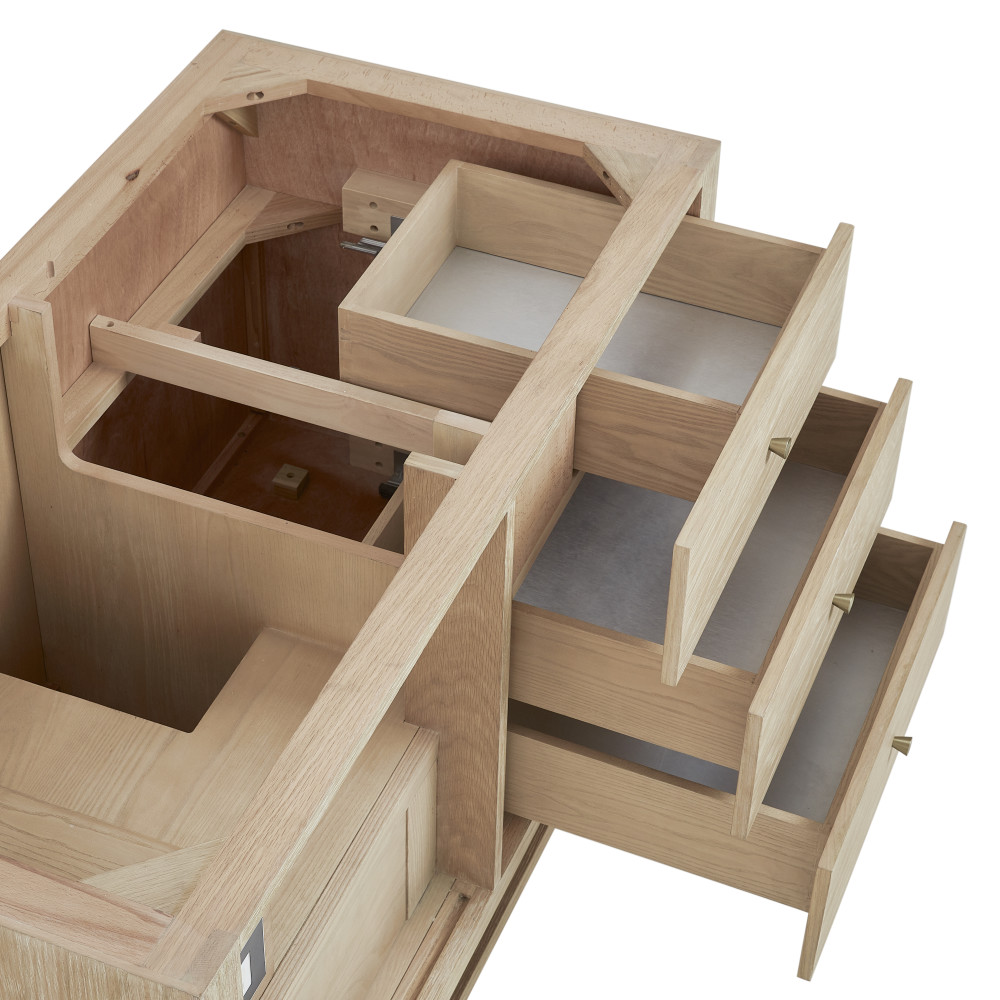 Crafted with precision, the understated waterfall frame of the Marigot 48” single bathroom vanity is adorned with tambour doors, adding a touch of elegance to its contemporary design. The cerused Sunwashed Oak finish creates a captivating warmth that is accentuated by Champagne Brass hardware. Three drawers and one tambour door with an interior shelf and drawer provide ample storage while maintaining a sleek profile. The integrated power outlet and a lower shelf makes this vanity incredibly functional.