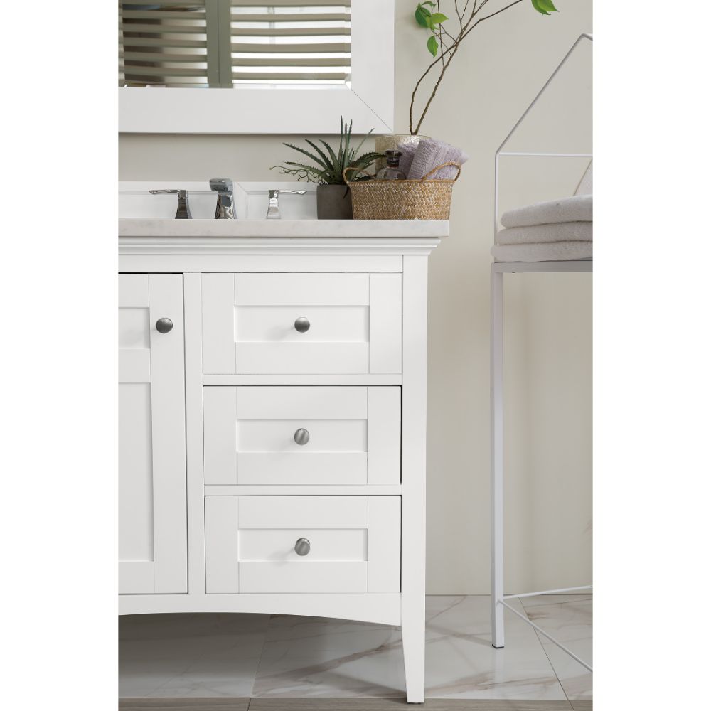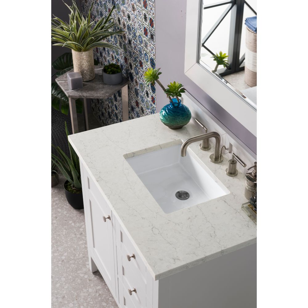 The Palisades 36 inch Bathroom Vanity in Bright White features one door with interior shelf space, two drawers, and tapered legs. Premium features include an electrical and USB outlet located on a custom designed shelf behind the door and a bamboo drawer organizer.