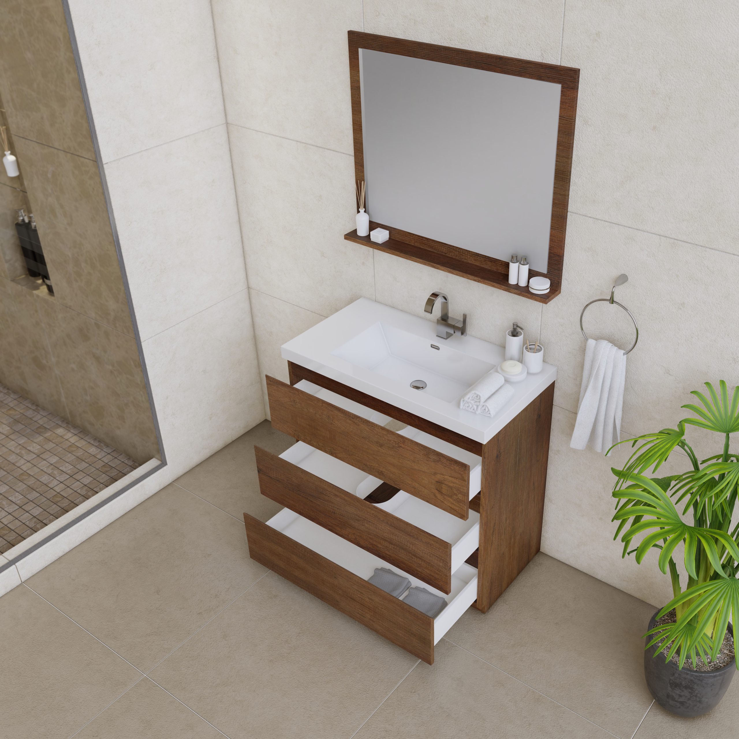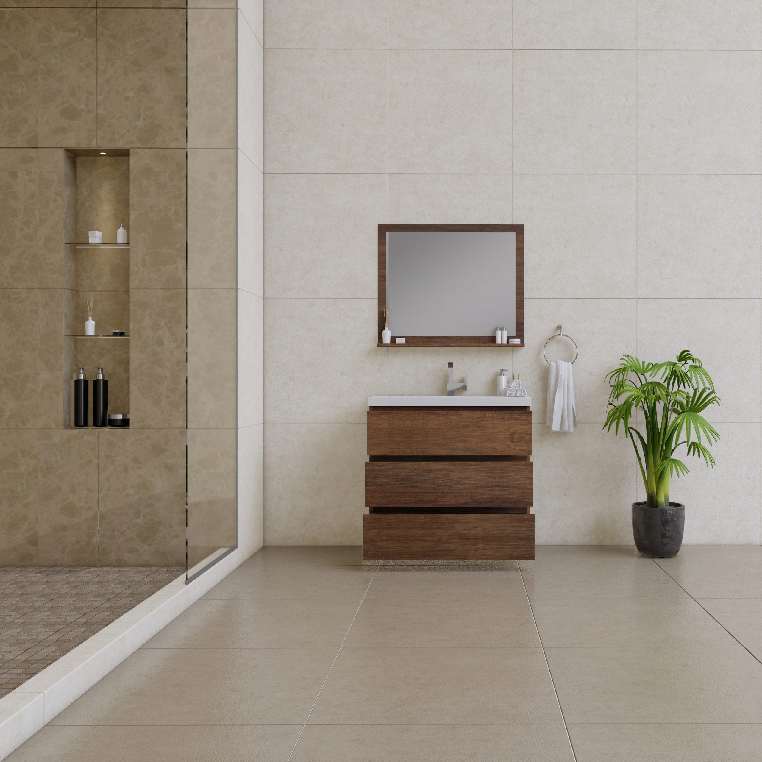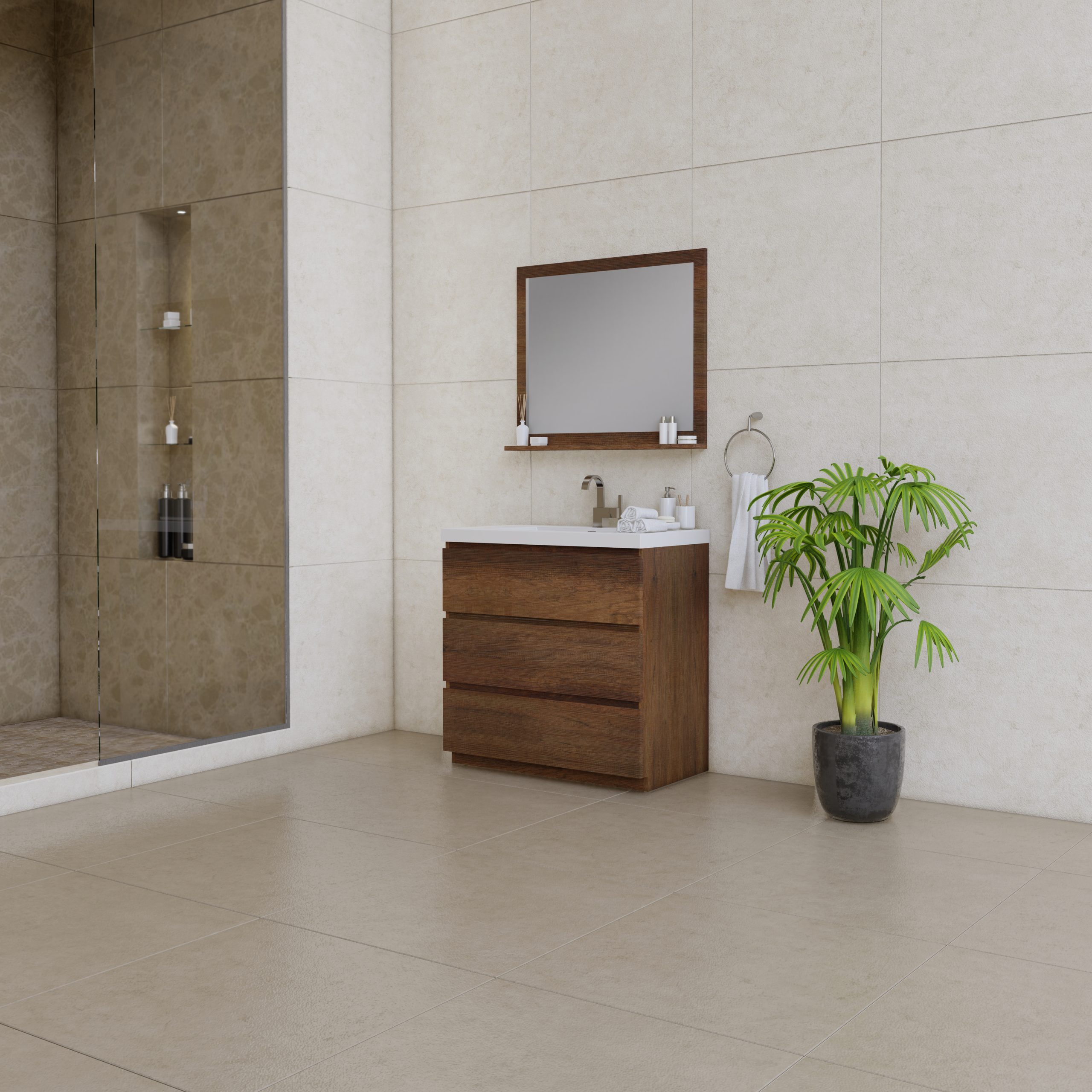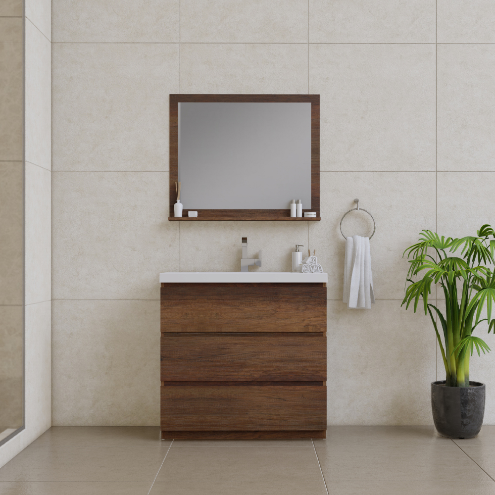 Add warmth and sophistication to your bathroom with the Paterno 36 Inch Freestanding Bathroom Vanity in Rosewood. Designed for both elegance and practicality, this freestanding vanity features a rich woodgrain finish, a spacious integrated sink, and ample storage space, making it a perfect choice for small to medium-sized bathrooms. The warm Rosewood tone enhances any décor, from modern to transitional, while providing a timeless and stylish look. Perfect for those who seek style, practicality, and durability, the Paterno 36″ Freestanding Vanity in Rosewood with an integrated sink is an elegant and functional upgrade for any bathroom.