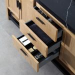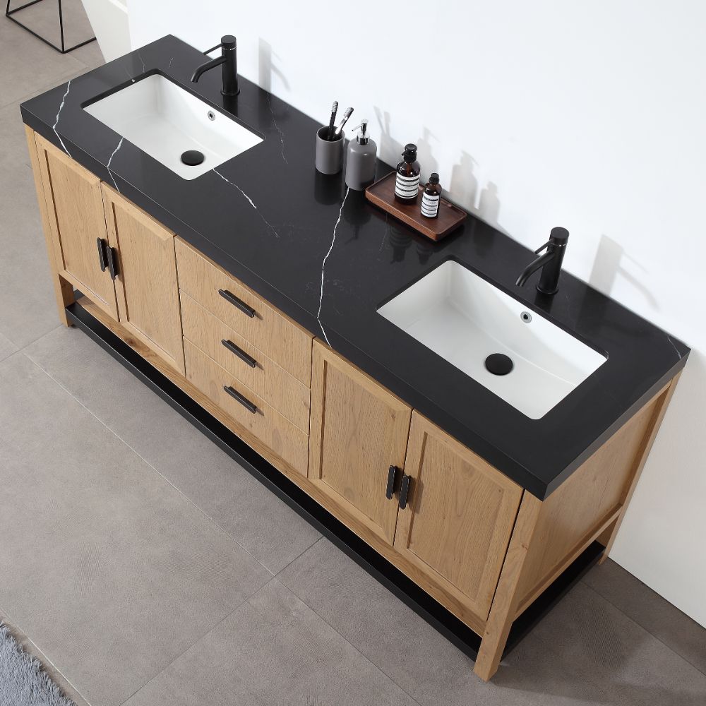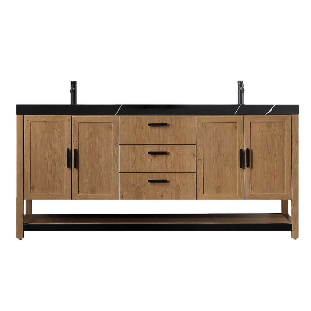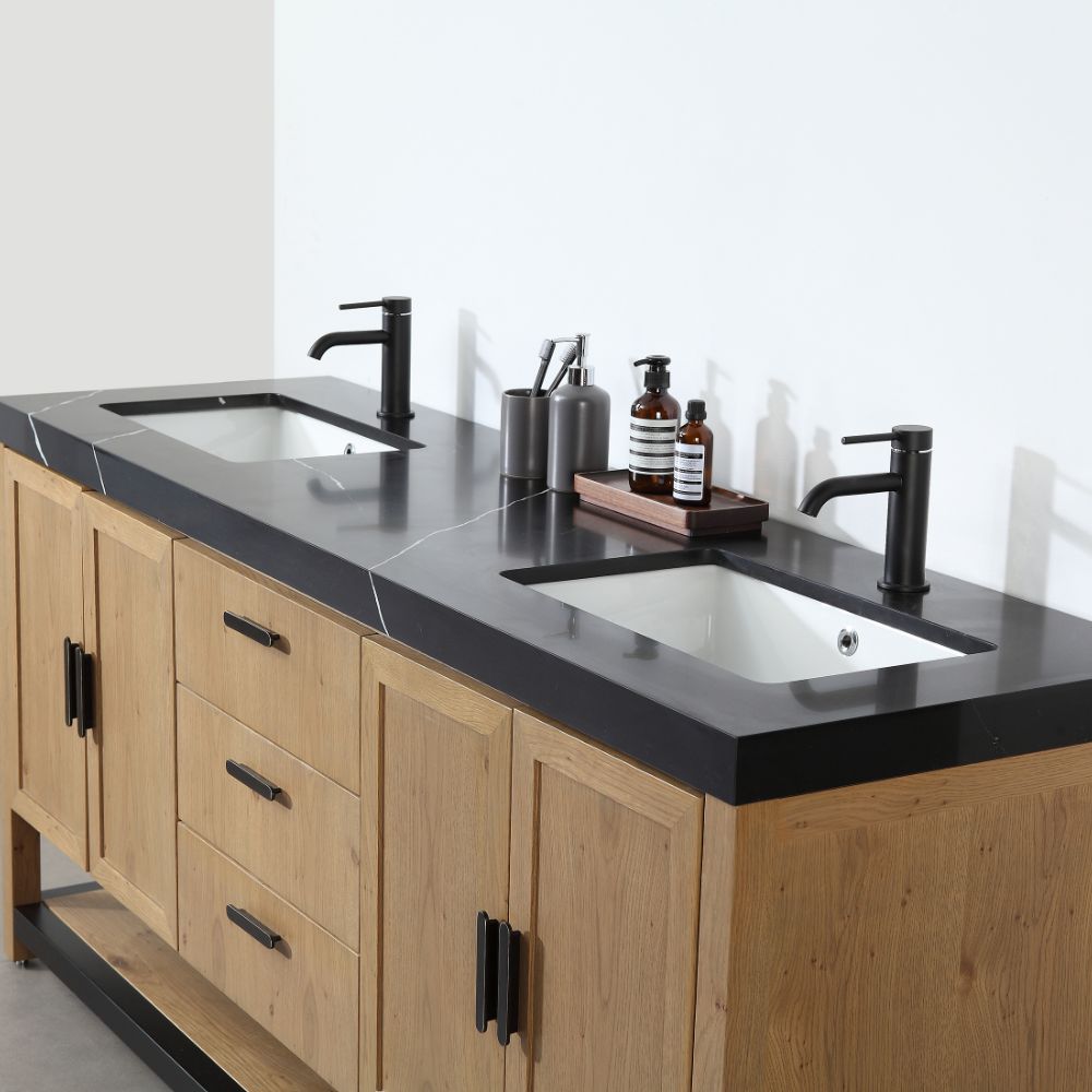 Winchester 72 inch Freestanding Double Bathroom Vanity With Black Top – Pecan Oak is a classic-inspired vanity that will bring a sense of organic luxury to your bath space. Three drawers and two cabinets on both sides allow for extensive storage. This open bottom vanity is offset by elegant, black handles. The entire piece is topped off with a luxurious Black Marquina Quartz countertop and an under-mount sink. Revival collection gives its users a feel of warm, contemporary sophistication.
