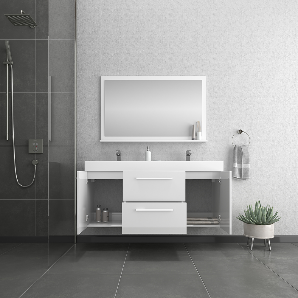 Elevate your bathroom with the Ripley 60 Inch Wall-Mounted Double Bathroom Vanity in Glossy White, a perfect combination of sleek modern design and practical functionality.