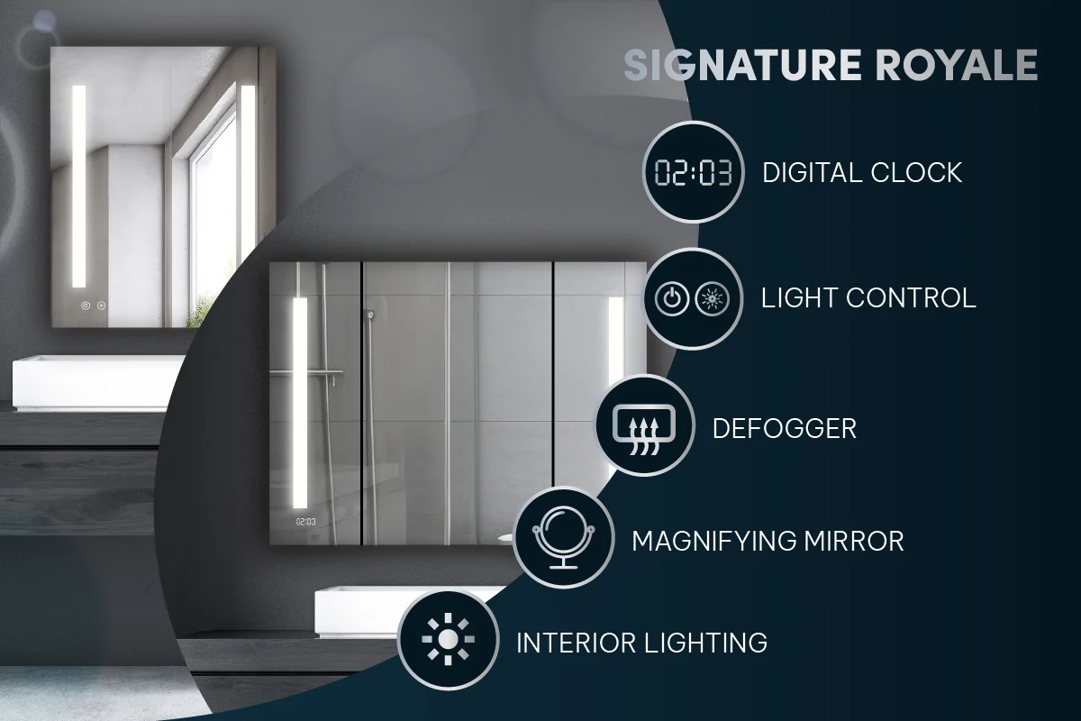 Signature Royale LED 24 inch LED lighted medicine cabinet adds elegance and beauty to any bathroom. Signature Royal is the most technologically advanced design featuring  cutting-edge 3D lighting with three adjustable temperatures: Warm, Cool, and Neutral. Besides durability and great style, this medicine cabinets can be recessed or surface mounted with the side mirrors included.  Each light has a built-in dimmer on it. As always, our LED digital clock comes standard in the Signature Royale. The interior light has a beautiful inline LED light. Of course, the Signature Royale model as always comes with an automatic defogger, so the mirror does not get steamed in the shower as well as an interior electrical outlet and USB charging ports.