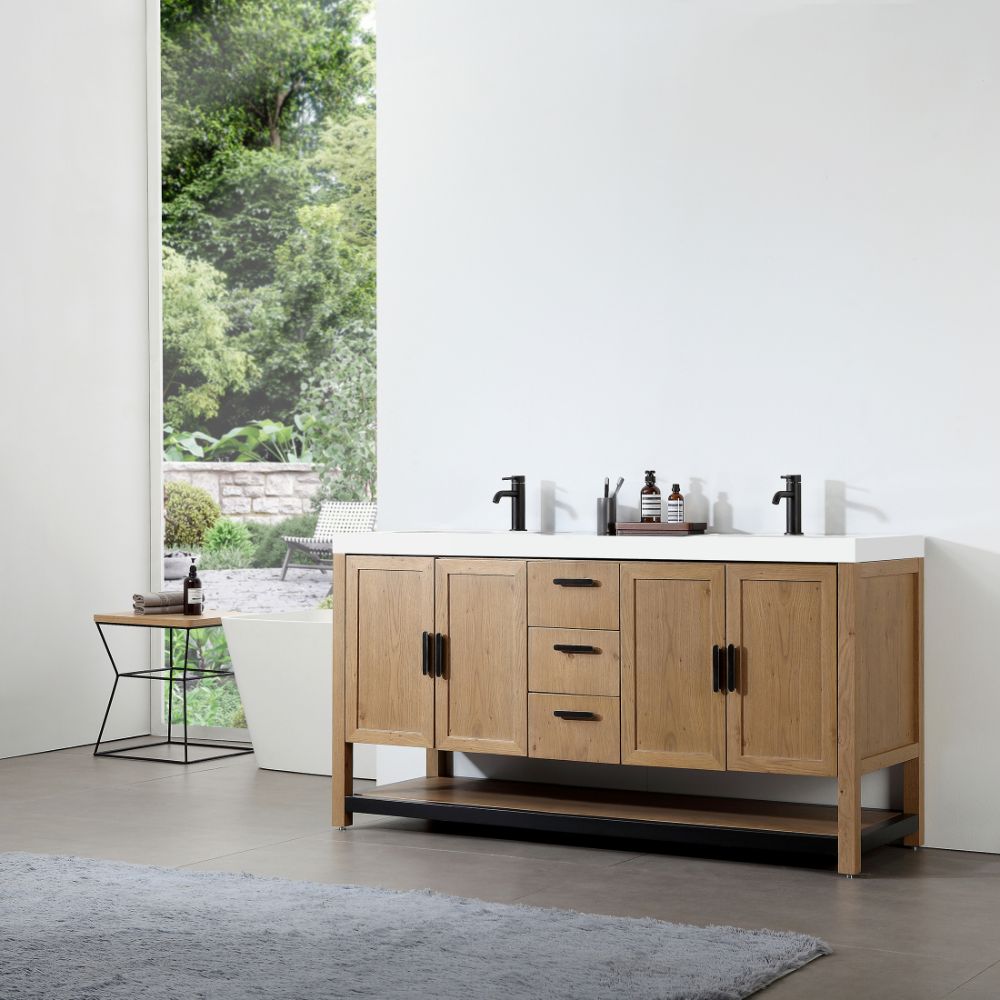 Elevate your bathroom with the timeless elegance and functional charm of the Winchester 60-Inch Double Bathroom Vanity. Crafted with a warm Pecan Oak finish, this vanity brings natural beauty and rustic sophistication to any space. The sleek white countertop offers a striking contrast, enhancing its modern farmhouse appeal while providing a durable and stylish surface for daily use.