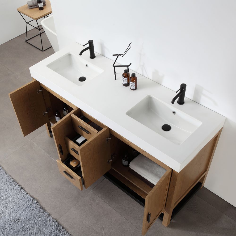 Winchester 60″ open bottom bathroom vanity with white quartz top is a classic-inspired vanity that will bring a sense of organic luxury to your bath space.