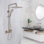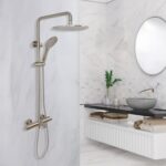 Zen Thermostatic Shower System features a 10″ rain head, 3-function hand shower, and tub spout with anti-scald control. Available in Brushed Gold, Brushed Nickel, Chrome, and Matte Black.
