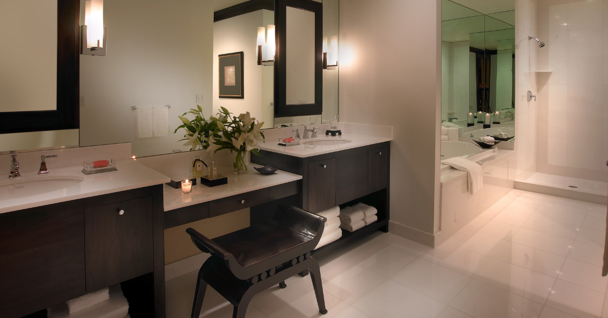 Another important component of renovating your large bathroom is electrical outlet placement. Since you have a larger space to renovate, you’ll have to think about where you’ll want your cords to run.