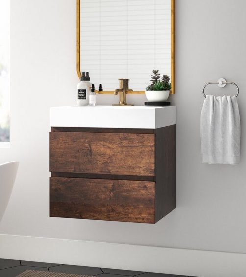 A wall mount vanity can be mounted right on the wall and the open area underneath makes a tiny bathroom feel larger. The floating vanity takes up less square footage than a conventional one and helps in generating an uncluttered, clean feel to the bathroom.